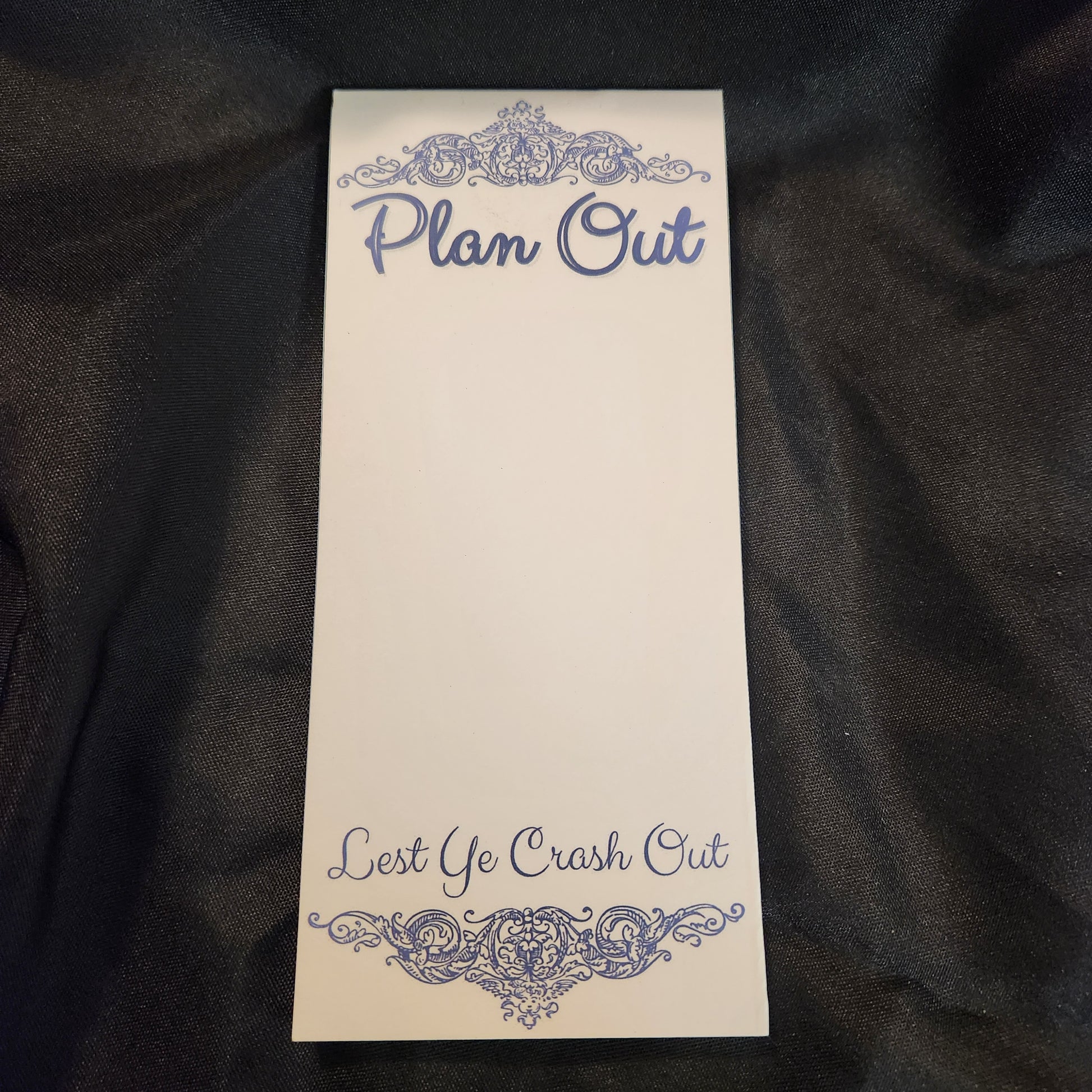 Because life is messy, deadlines are ruthless, and naps are tempting, this handmade tear-off notepad reminds you to “Plan out Lest Ye Crash out.” Perfect for jotting down tasks, goals, and little reminders before your brain hits overload—or your caffeine does. Perfect for: Overachievers, chronic planners, and every crash out queen who likes to pretend they have it together. Making lists so long they double as motivational tools and mild intimidation. Desk warriors who need a mix of humor and accountability to survive the week. Handmade tear-off pages ready for your scribbles, schemes, and survival tactics—because adulting is hard, but planning makes it slightly less fatal.