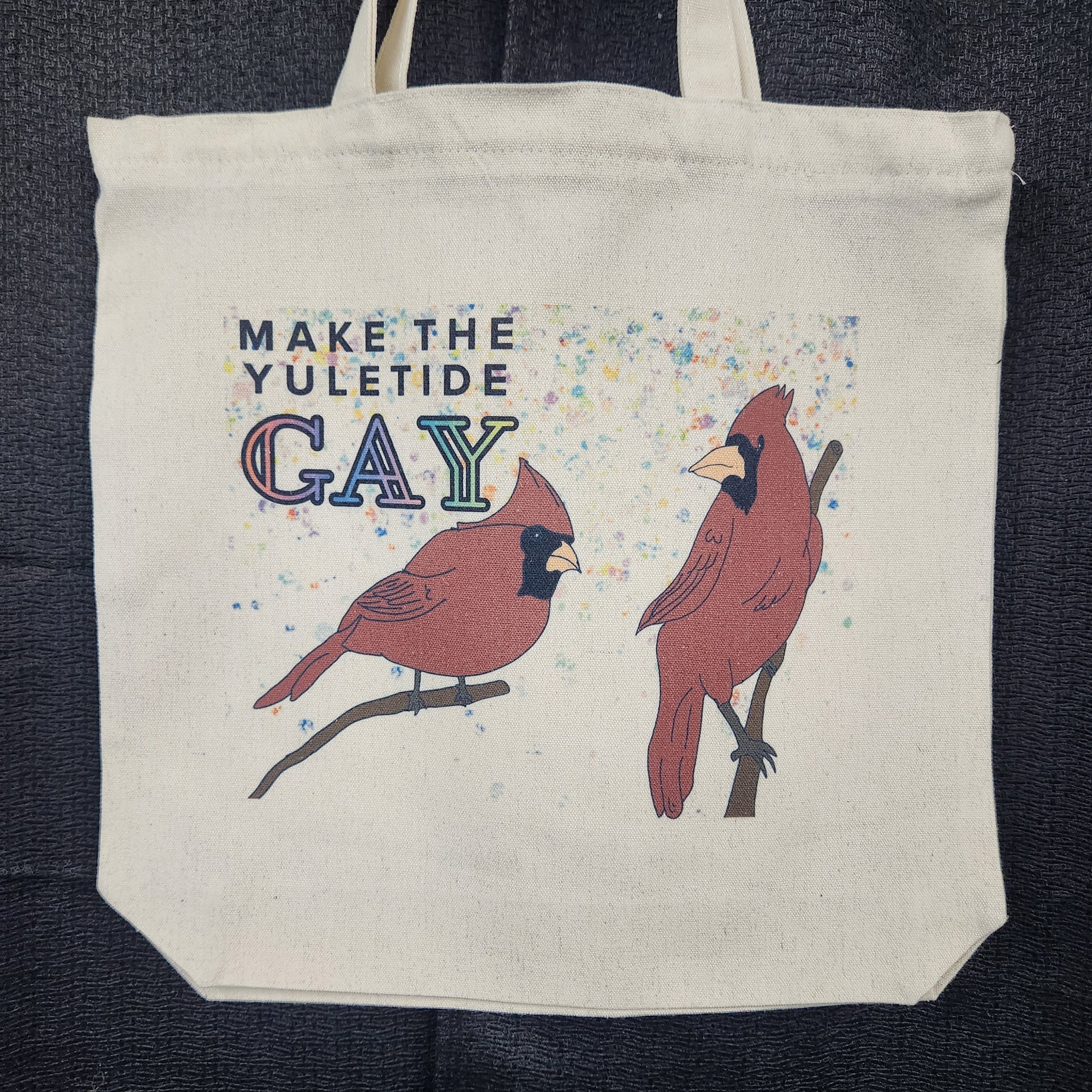 Make the Yuletide GAY. Two cardinals, zero judgment, 100% festive sass. This tote spreads holiday cheer, good vibes, and the important reminder that the holidays aren’t just about mistletoe—they’re about being fabulous, loud, and unapologetic. Perfect for carrying gifts, cookies, or your general holiday chaos. Happy Gay Cardinal Season! Because nothing says festive like feathered friends who know how to sleigh. Each 15x15 inch tote is hand-printed using a professional, colorfast dyeing process, ensuring vibrant, long-lasting artwork that won't crack or peel with use. Unlike vinyl or DTF transfers, which can degrade after multiple washes, our dyeing method is fully machine washable—so your tote stays beautiful and practical over time.
